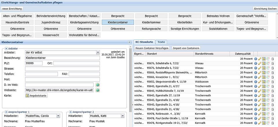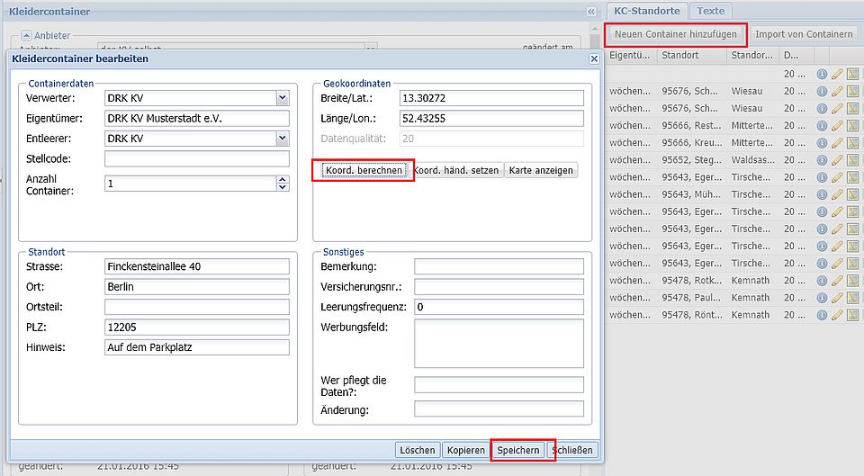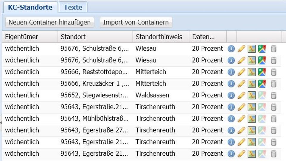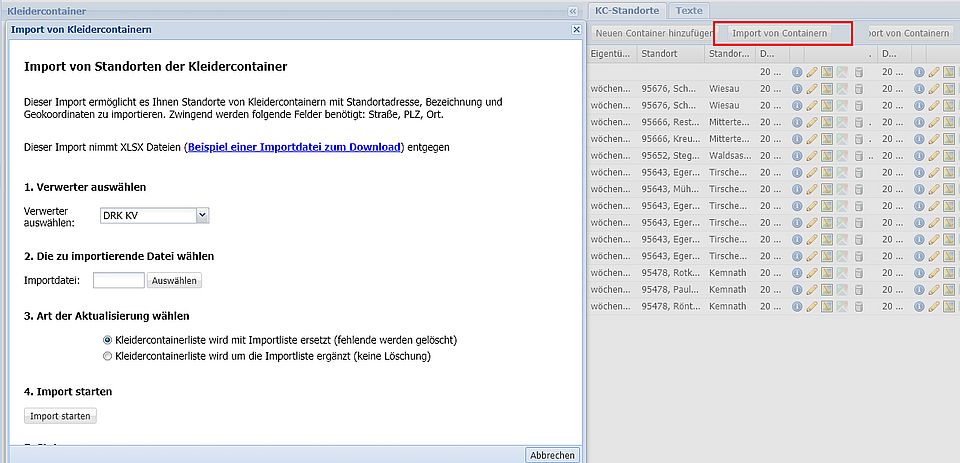 Kleidercontainerliste um Importliste ergänzen. Die aktuelle Liste erweitert die ggf. bestehenden Standorte. Es werden jedoch keine Dubletten angelegt.