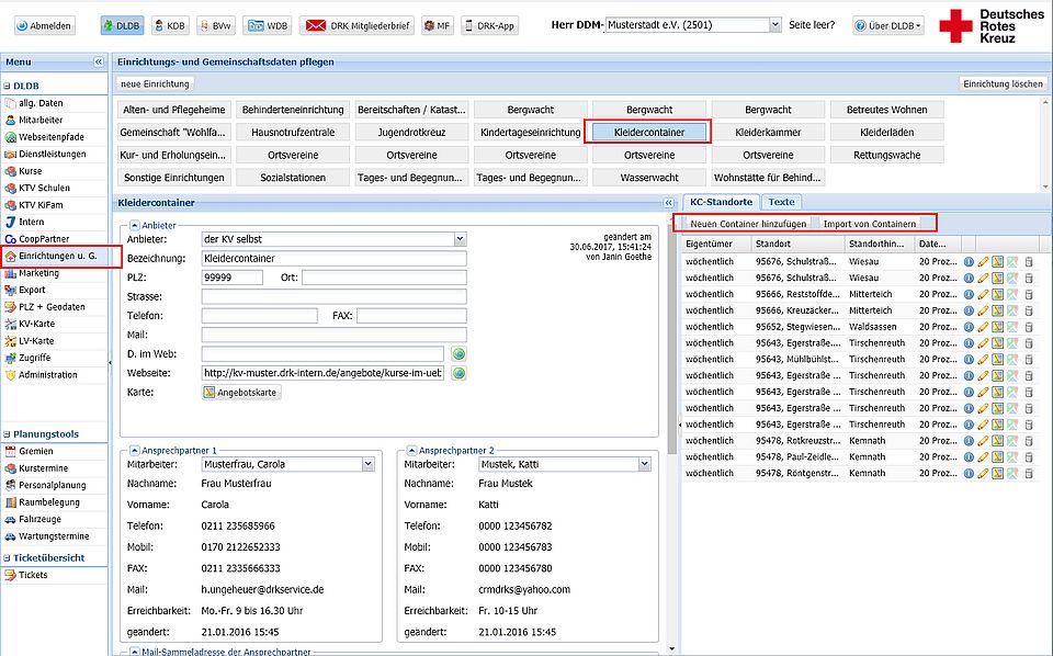 Melden Sie sich in der Dienstleistungsdatenbank (DLDB) auf DRK-Intern.de an. Klicken Sie in Ihrem KV auf die Kategorie „Einrichtungen“. Wählen Sie das Datenblatt „Kleidercontainer“ aus. Sollten Sie noch kein Datenblatt „Kleidercontainer“ vorfinden, legen Sie dieses bitte zunächst an: