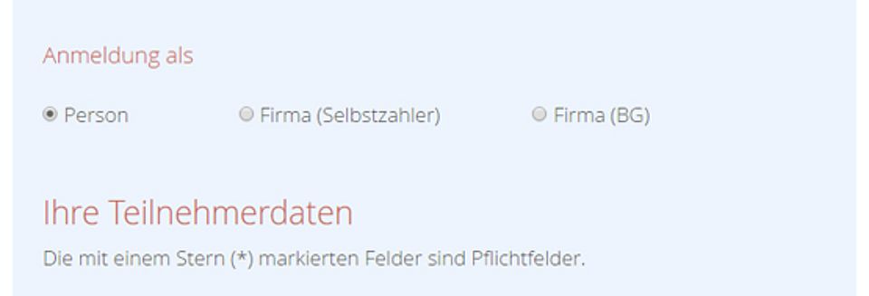 Firma Selbstzahler: Firma, Straße, PLZ, Ort, Vor- und Nachname und die Mailadresse des Ansprechpartners und das Geburtstagdatum der Teilnehmer